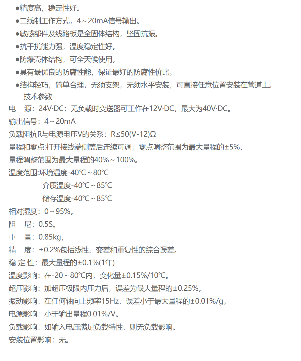 HP-4压力变送器是一种将压力信号转换为标准电信号(如4-20mA、0-10V或数字信号)的工业传感器,可测量液体、气体、蒸汽压力测量、液体液位测量。适用于爆炸危险区域,防爆等级Exd ⅡCT6。广泛应用于石油化工、电力、水处理、制药等行业,用于实时监测和控制压力参数。